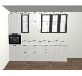 Размер кухонного гарнитура: Ширина левой стороны 3000 мм. Ширина правой стороны 1700 мм. Высота 2336 мм. Глубина 600 мм. (с учетом столешницы)