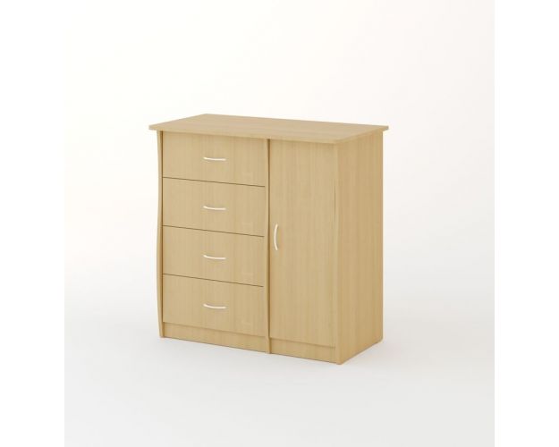 Вместительный комод оснащен четырьмя широкими выдвижными ящиками и отделом с распашной дверцей. Модель отличается простотой, функциональностью и надежностью. Его классический стиль отлично дополнит интерьер вашей комнаты.